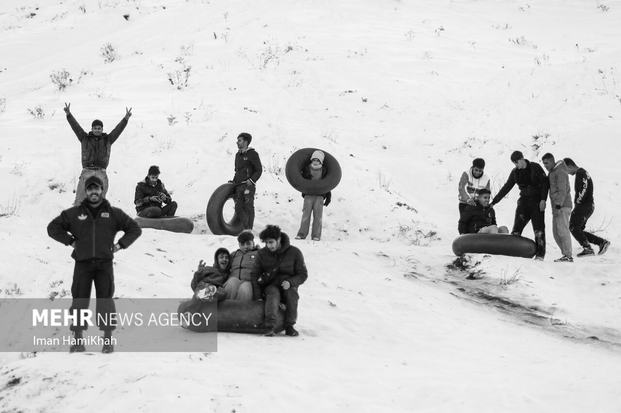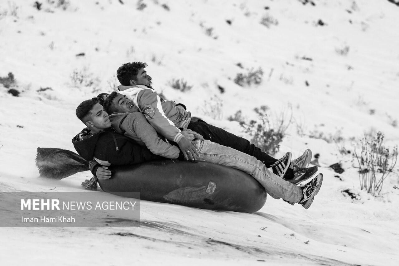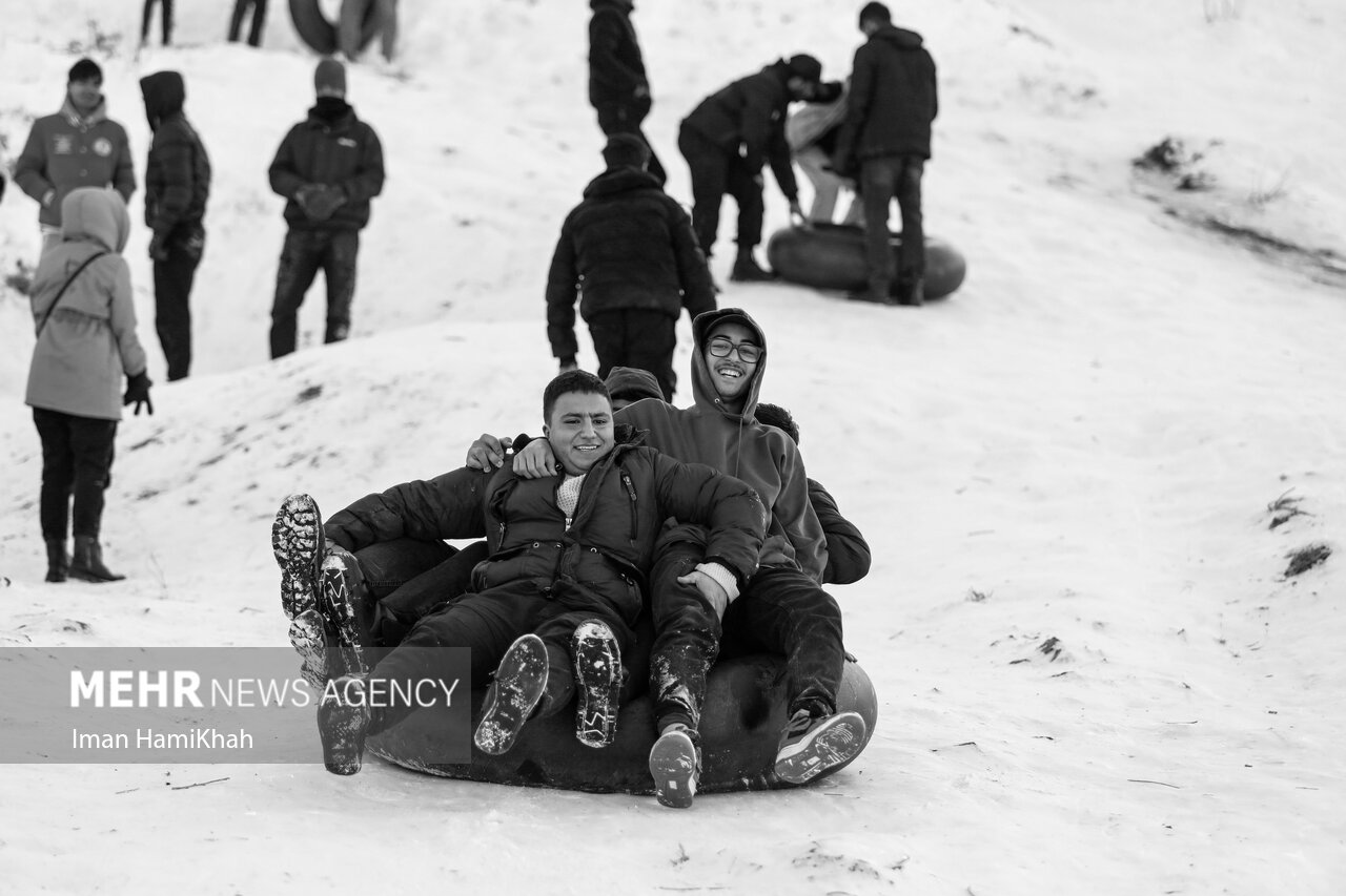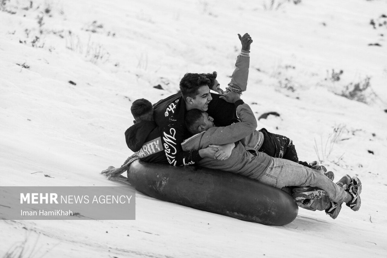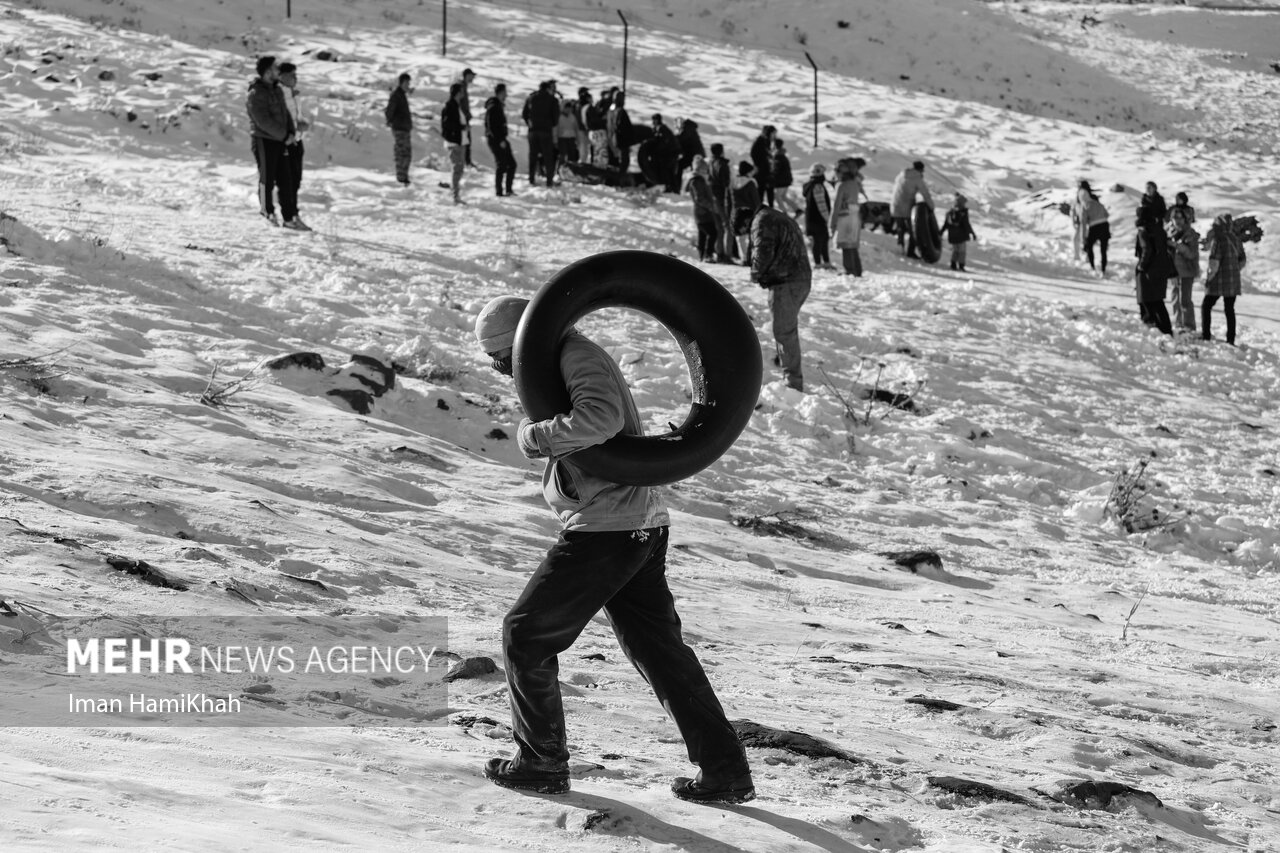 تیوب سواری در ارتفاعات همدان، بارش برف روزهای گذشته در همدان شرایط مناسبی برای تفریحات زمستانی مردم به وجود آورده است.