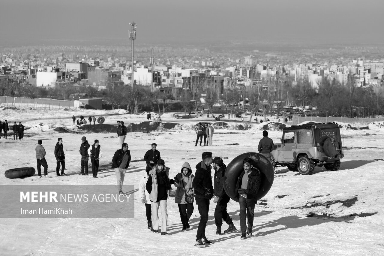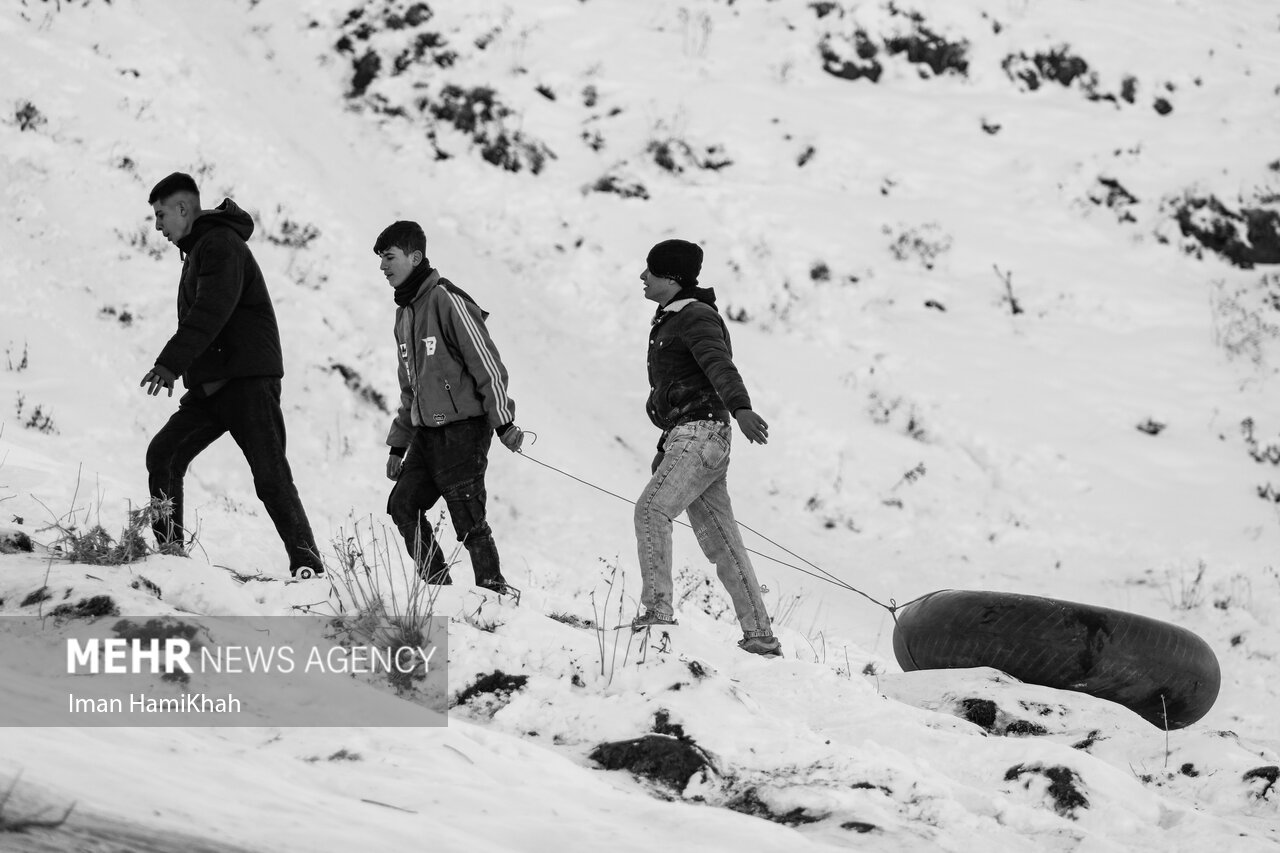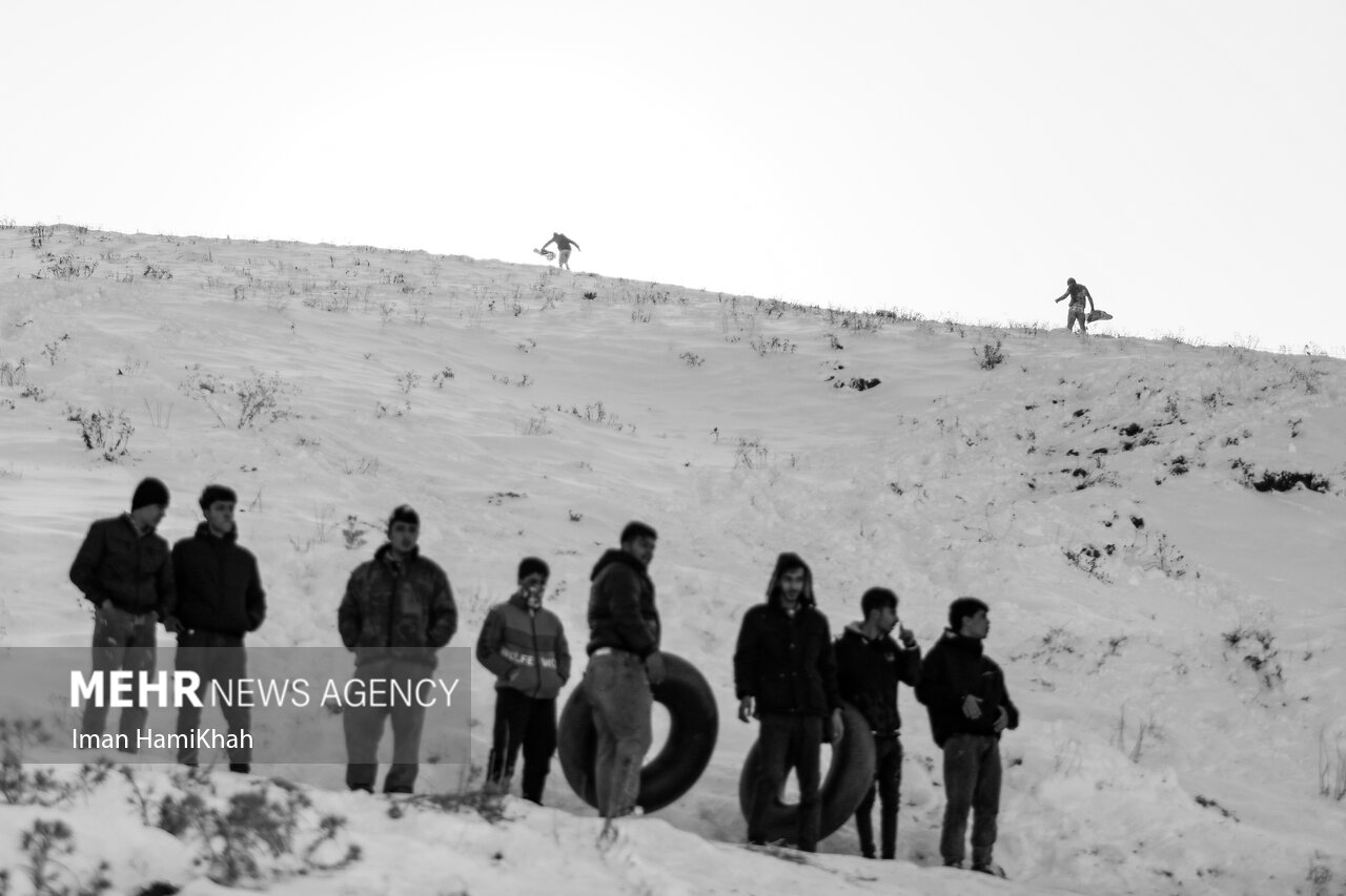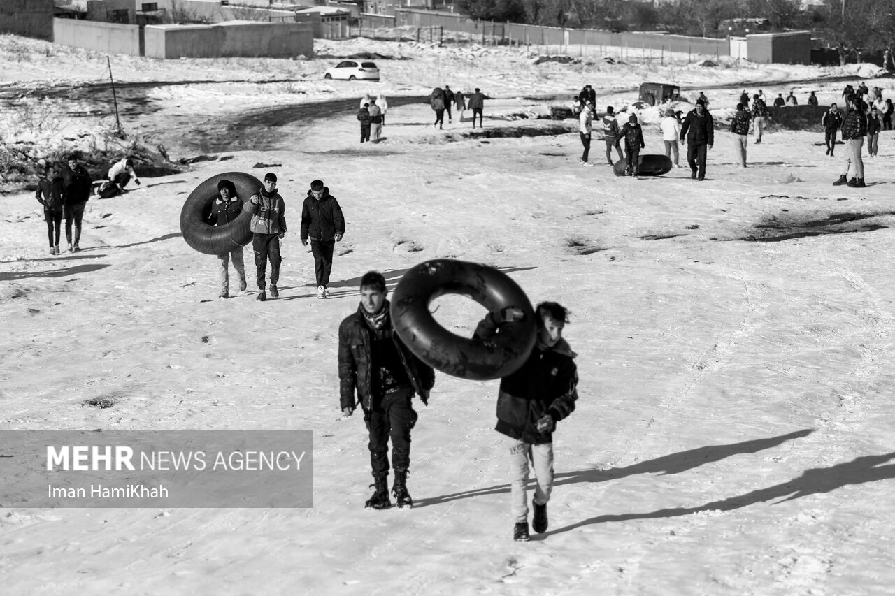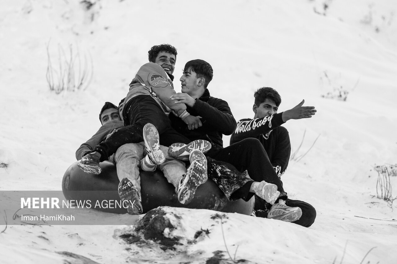 تیوب سواری در ارتفاعات همدان، بارش برف روزهای گذشته در همدان شرایط مناسبی برای تفریحات زمستانی مردم به وجود آورده است.