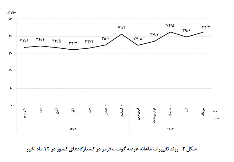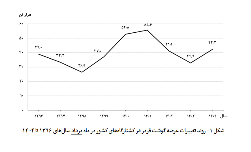مقایسه عملکرد کشتارگاه‌های رسمی کشور در مرداد ۱۴۰۴ با ماه مشابه سال ۱۴۰۳ نشان‌دهنده افزایش ۲۸ درصدی مقدار عرضه گوشت قرمز در کشتارگاه‌های رسمی کشور است؛ مقدار تولید گوشت در مرداد ۱۴۰۴ نسبت به ماه مشابه سال ۱۴۰۳ برای گوسفند و بره ۲۹ درصد، برای بز و بزغاله ۴ درصد، برای گاو و گوساله ۳۲ درصد، برای گاومیش و بچه‌گاومیش ۵۹ درصد و برای شتر و بچه‌شتر ۳ درصد افزایش داشته است.